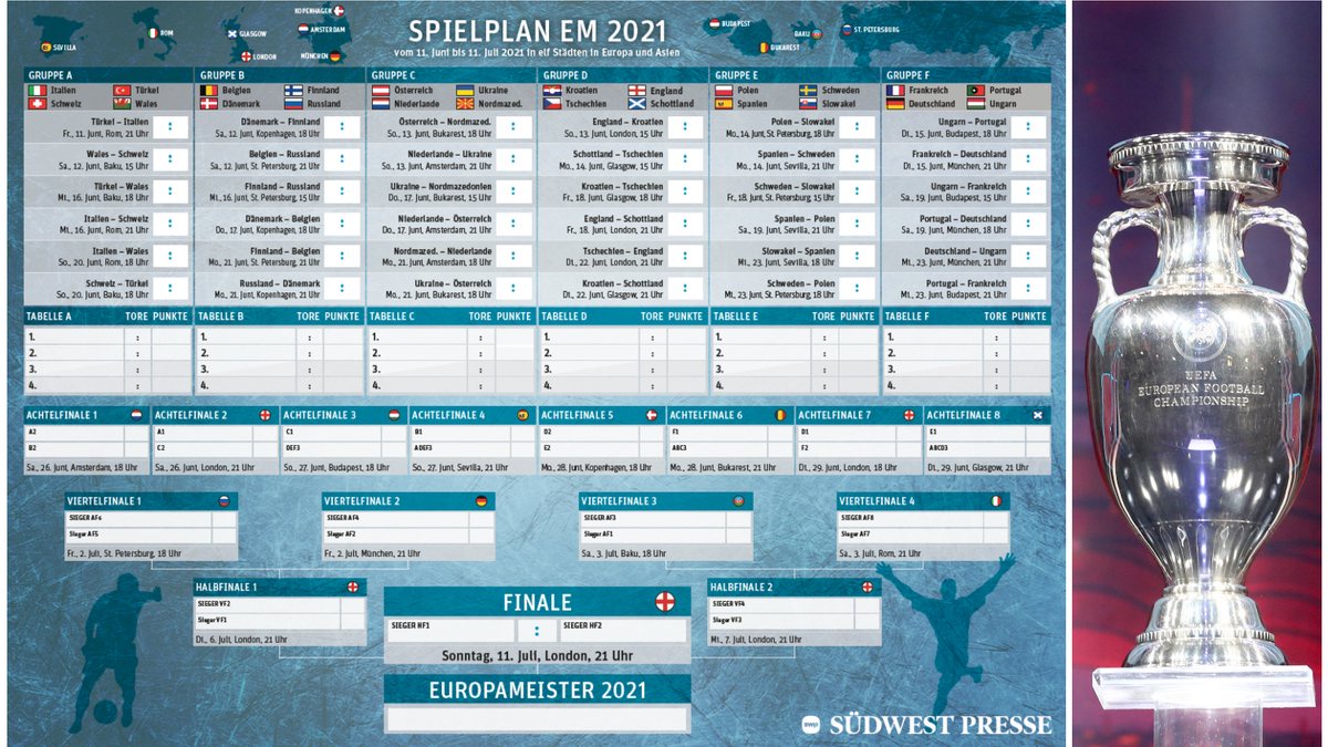Alle spiele und termine im überblick. Dezember in dieser zeit wurden 20 der 24 startplätze vergeben. Um so gut wie möglich auf die em 2021 vorbereitet zu sein, darf vor allem ein ausführlicher spielplan für die europameisterschaft 2021 nicht fehlen. Wir zeigen dir alle em 2020/21 gruppen, spiele und ergebnisse der vorrunde, des achtelfinale, des viertelfinale, des halbfinales des finales. Hier findest du den kompletten spielplan der em 2021 sowie die ergebnisse aller spiele. Um den überblick nicht zu verlieren, haben wir ihnen einen übersichtlichen fußball em 2021 spielplan pdf. Hier als pdf zum download. ⚽ alle spiele, termine und ergebnisse im überblick! Em 2021 spielplan zum download. Hänge es bei dir zuhause oder im büro auf und teile den tipps mit deinen freunden und kollegen. Der pdf spielplan zur fußball em 2020. Alle spiele der euro 2021 finden sie chronologisch sortiert in diesem spielplan. In unseren em spielplan 2021 finden sie jegliche einzelheiten über die em 2021 termine, die einzelnen spiele und die die em fußballspiele werden spannend.